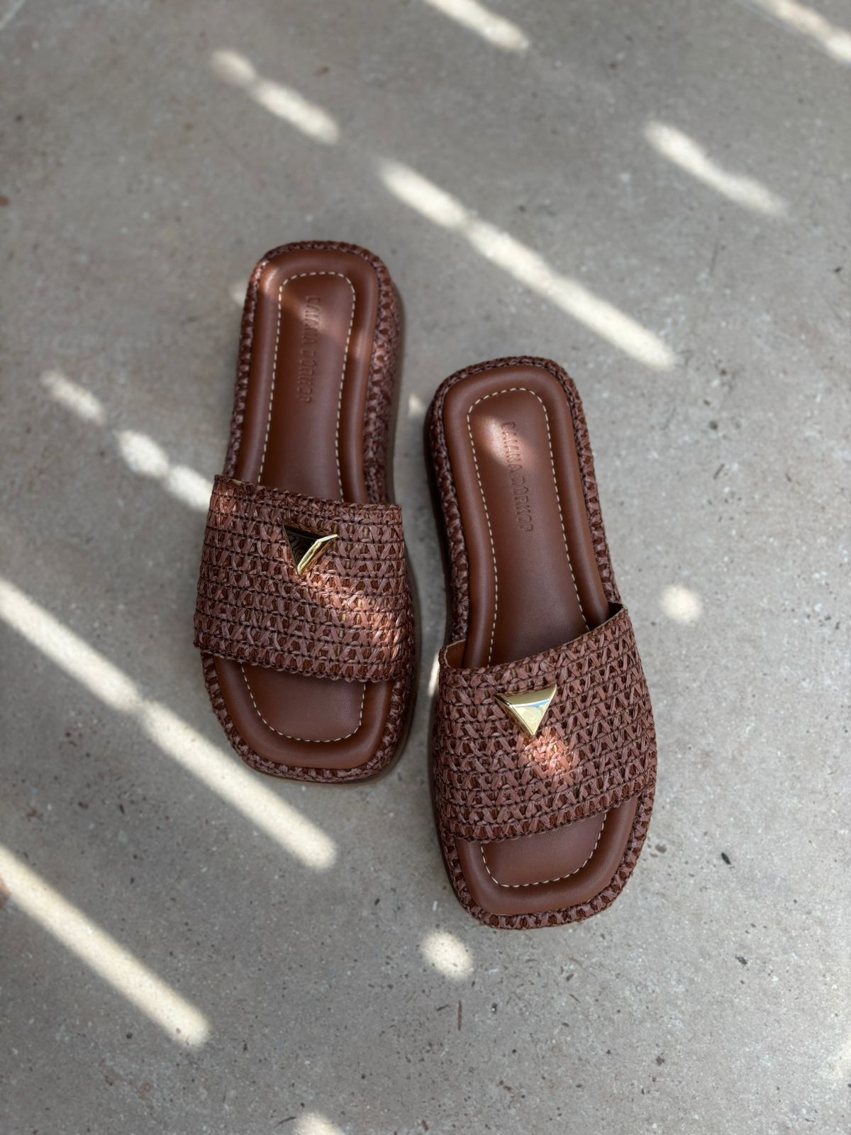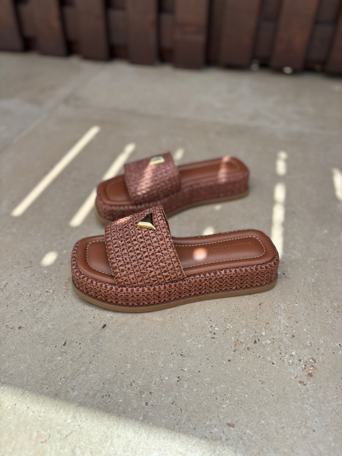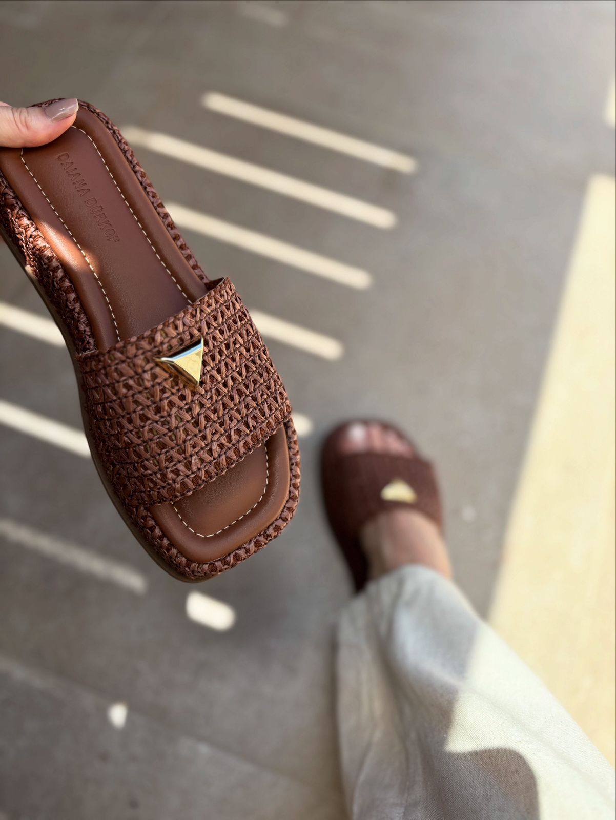 A Flatform em palha traduz a tendência artesanal da temporada.