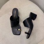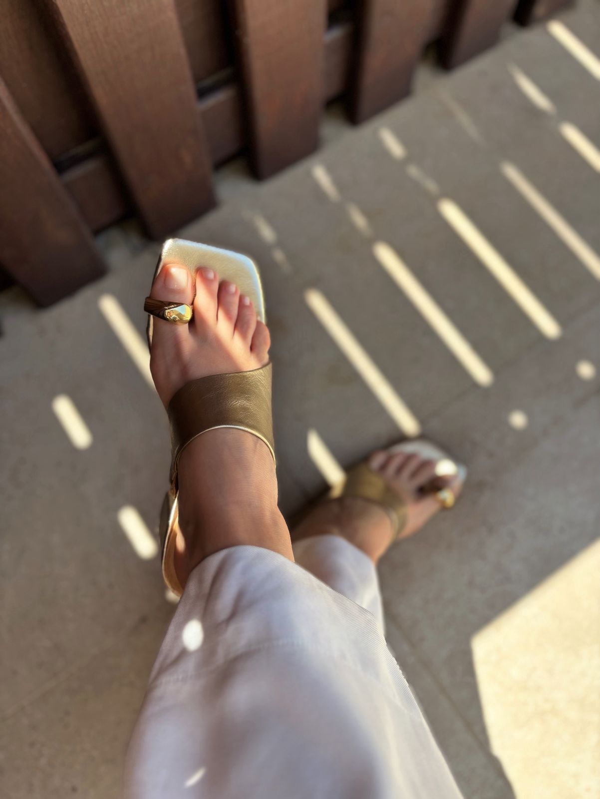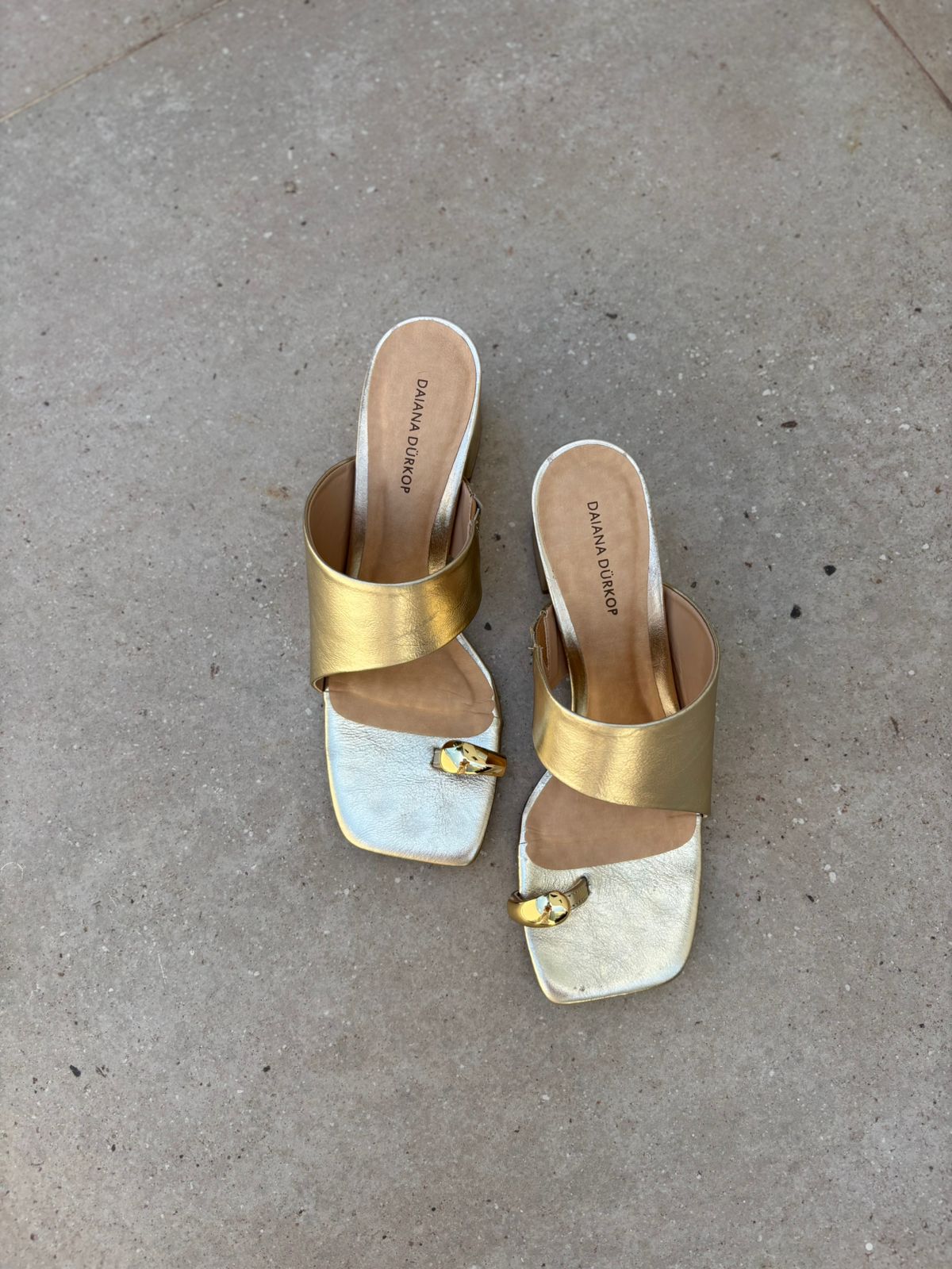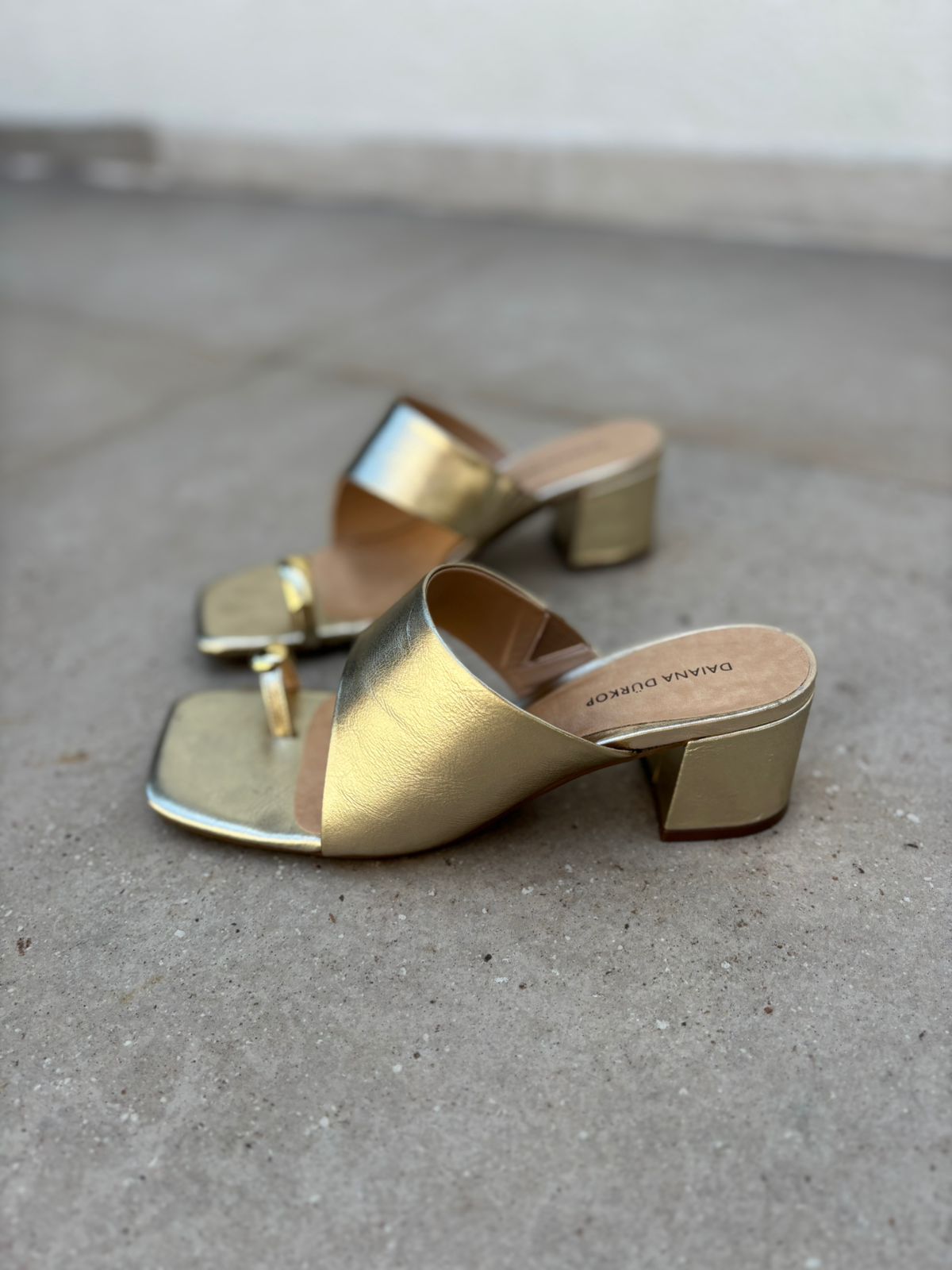 Tamanco de salto fabricado em Couro legítimo com detalhe com a peça em dourado, trazendo toda charme e elegância ao modelo.