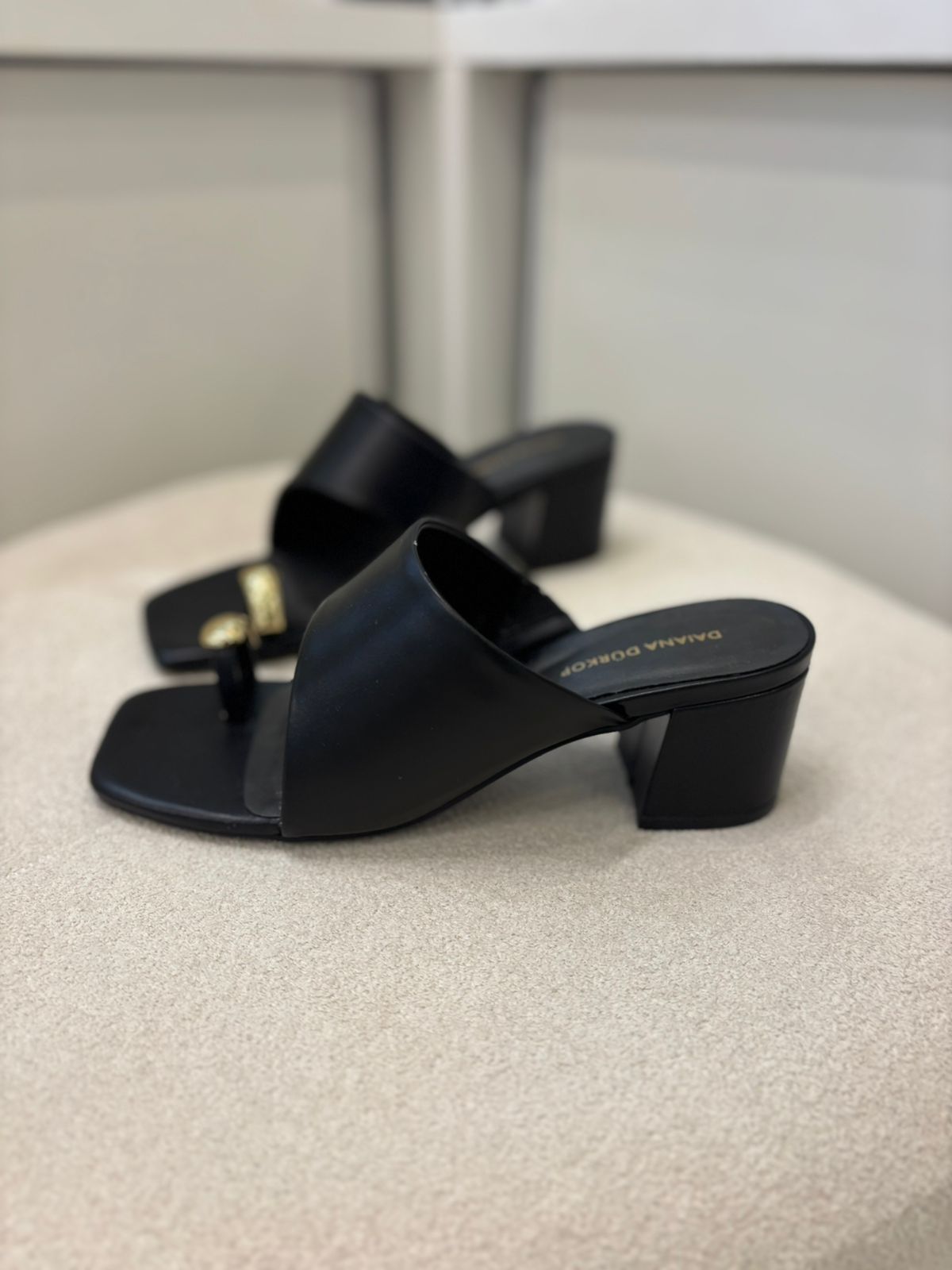 Tamanco de salto fabricado em Couro legítimo com detalhe com a peça em dourado, trazendo toda charme e elegância ao modelo.