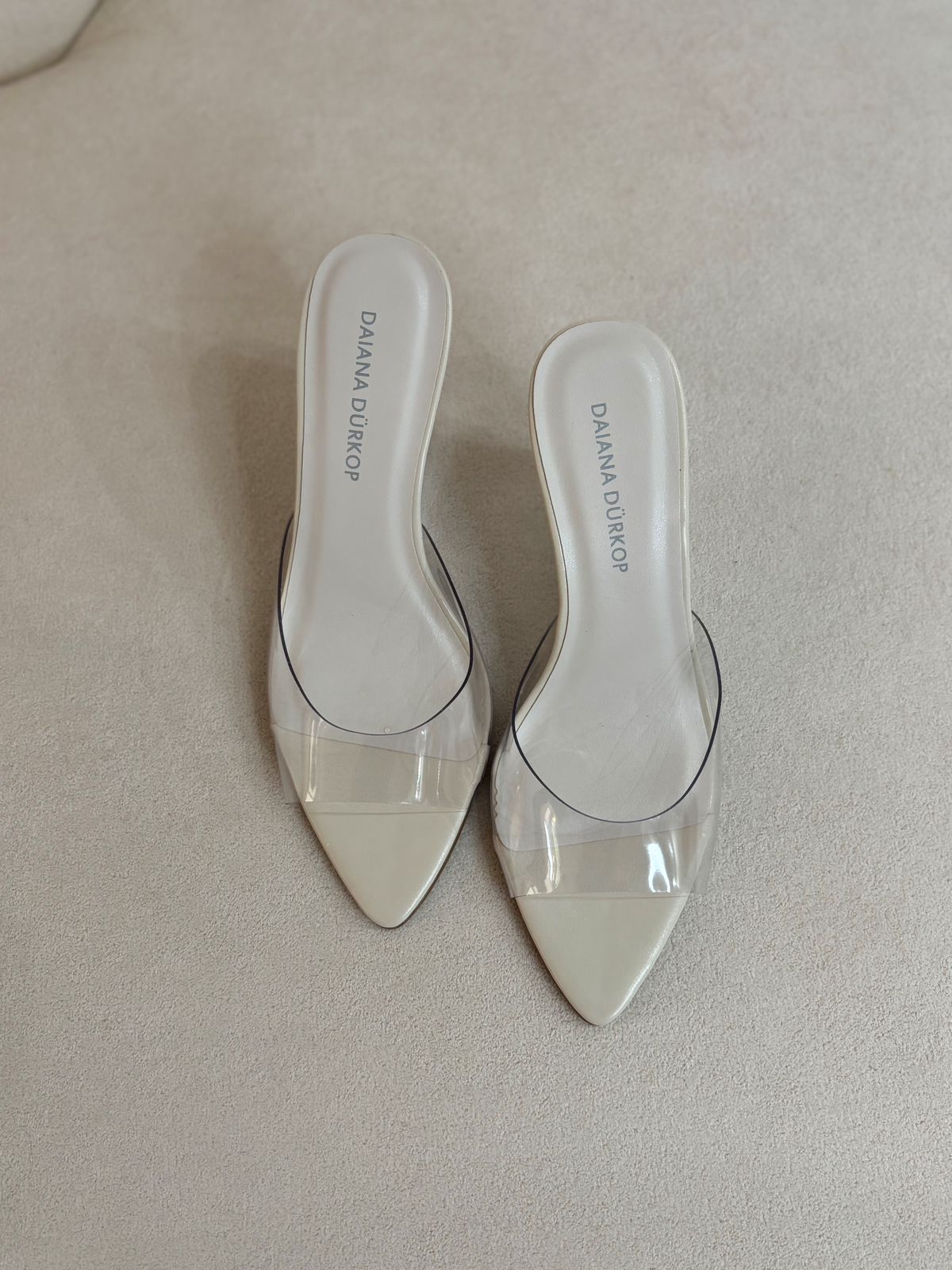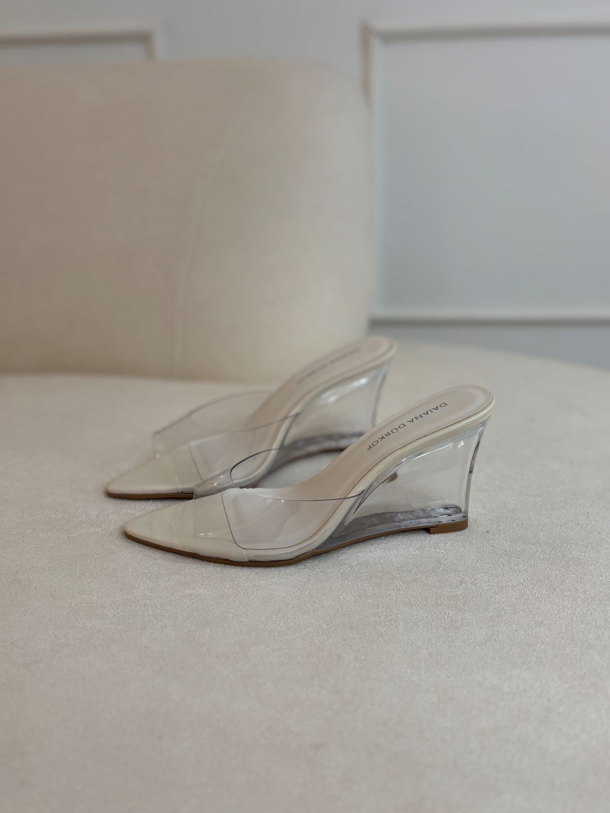 Tamanco off white, com salto acrílico e bico folha. Traz todo charme e elegância para a mulher.